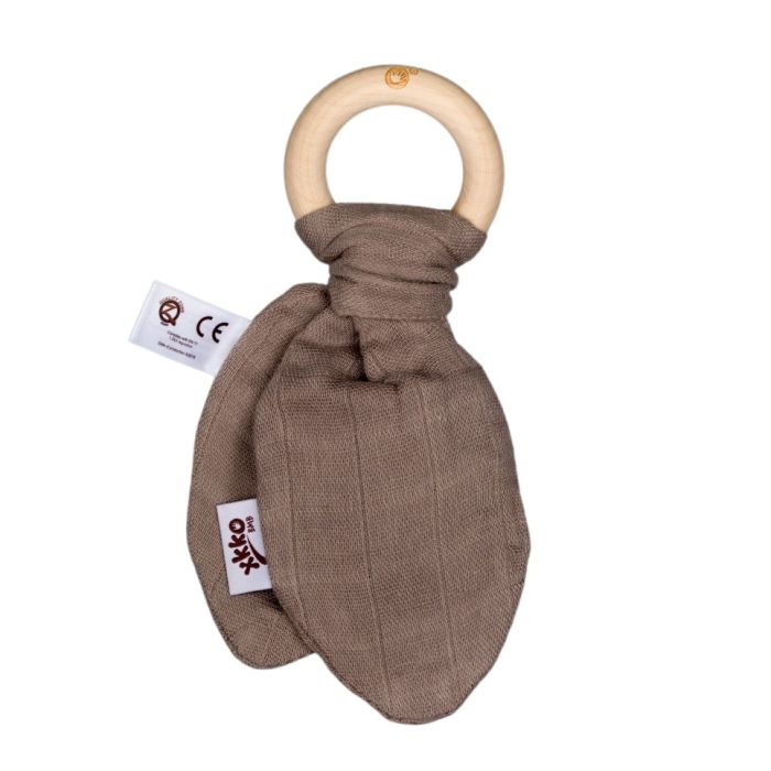 Dřevěné kousátko XKKO BMB s šustivými lístky z extrémně jemného bambusového mušelínu. Bambusová viskoza je antibakteriální a nezpůsobuje žádnou alergickou reakci.
