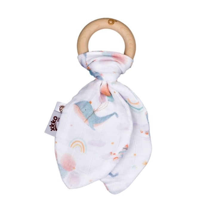 Dřevěné kousátko XKKO BMB s šustivými lístky z extrémně jemného bambusového mušelínu. Bambusová viskoza je antibakteriální a nezpůsobuje žádnou alergickou reakci.