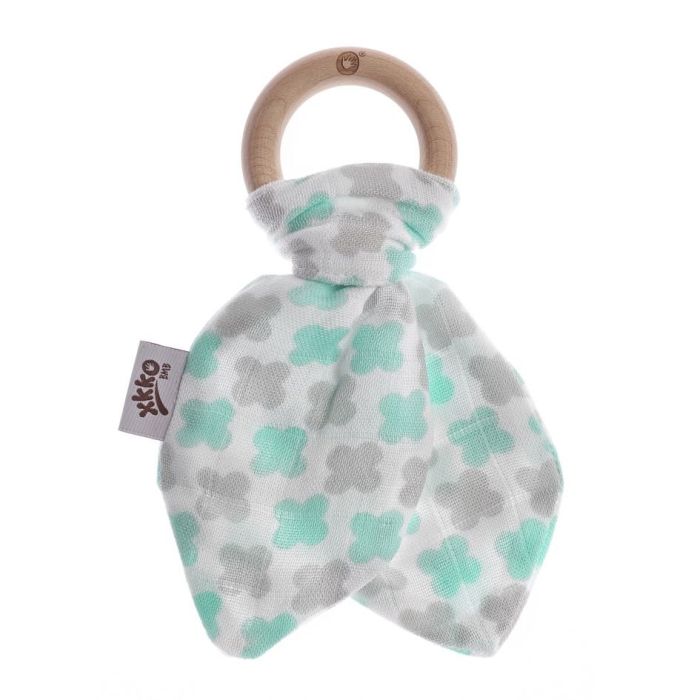 Dřevěné kousátko XKKO BMB s šustivými lístky z extrémně jemného bambusového mušelínu. Bambusová viskoza je antibakteriální a nezpůsobuje žádnou alergickou reakci.
