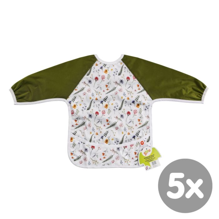 Praktický bryndáček XKKO s rukávy a kapsou, kterých chrání outfit vašeho dítěte při krmení nebo při prvních uměleckých pokusech s barvami.